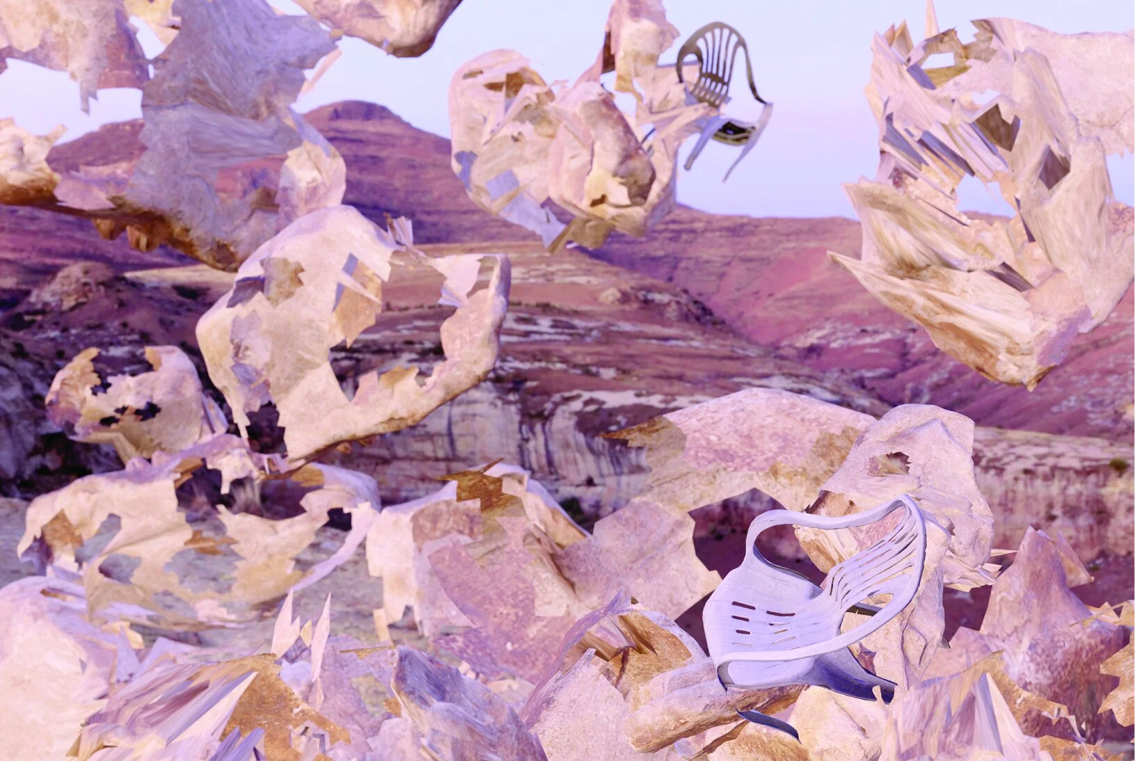 The starting point of this series is 3D scans (photogrammetry) of monoblock chairs in their natural environment—the beach. The 3D models are then digitally distorted and printed with a Xerox on paper. The prints are subsequently distorted once again into physical waves. This project explores the boundaries of digital and physical mediums, reflecting on how reality becomes distorted through digital means.
